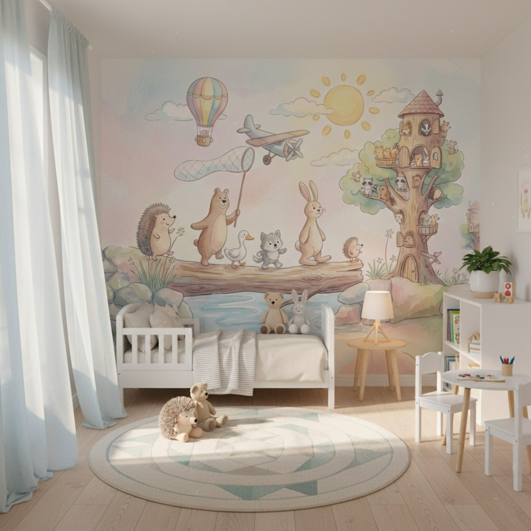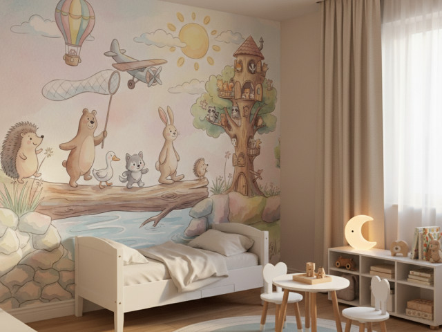 Animal Land to tapeta dziecięca z ilustracyjnym motywem zwierząt, zaprojektowana jako spokojna i przyjazna dekoracja do pokoju dziecka. Bajkowa scena pełna detali pobudza wyobraźnię i tworzy ciepłą, bezpieczną atmosferę.
