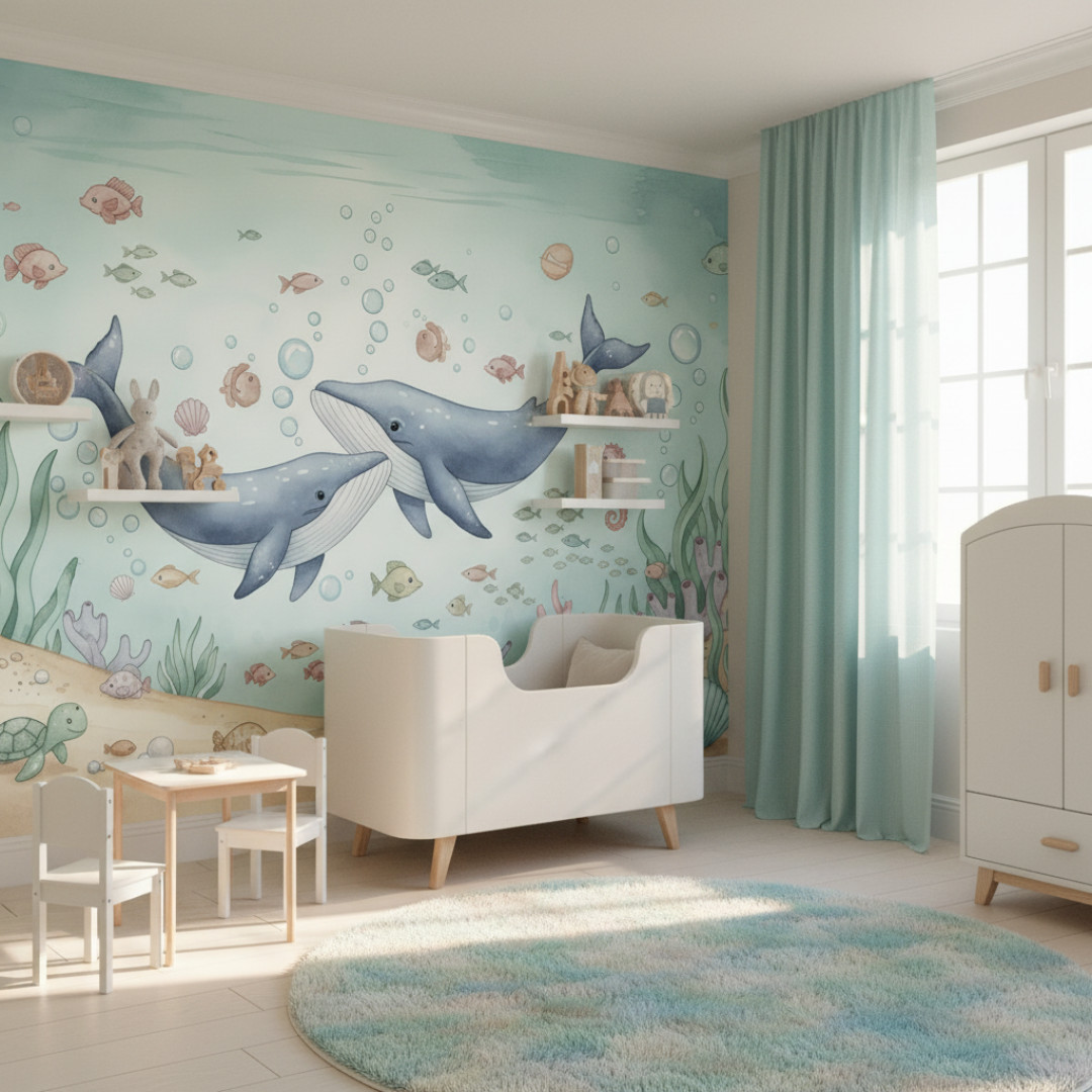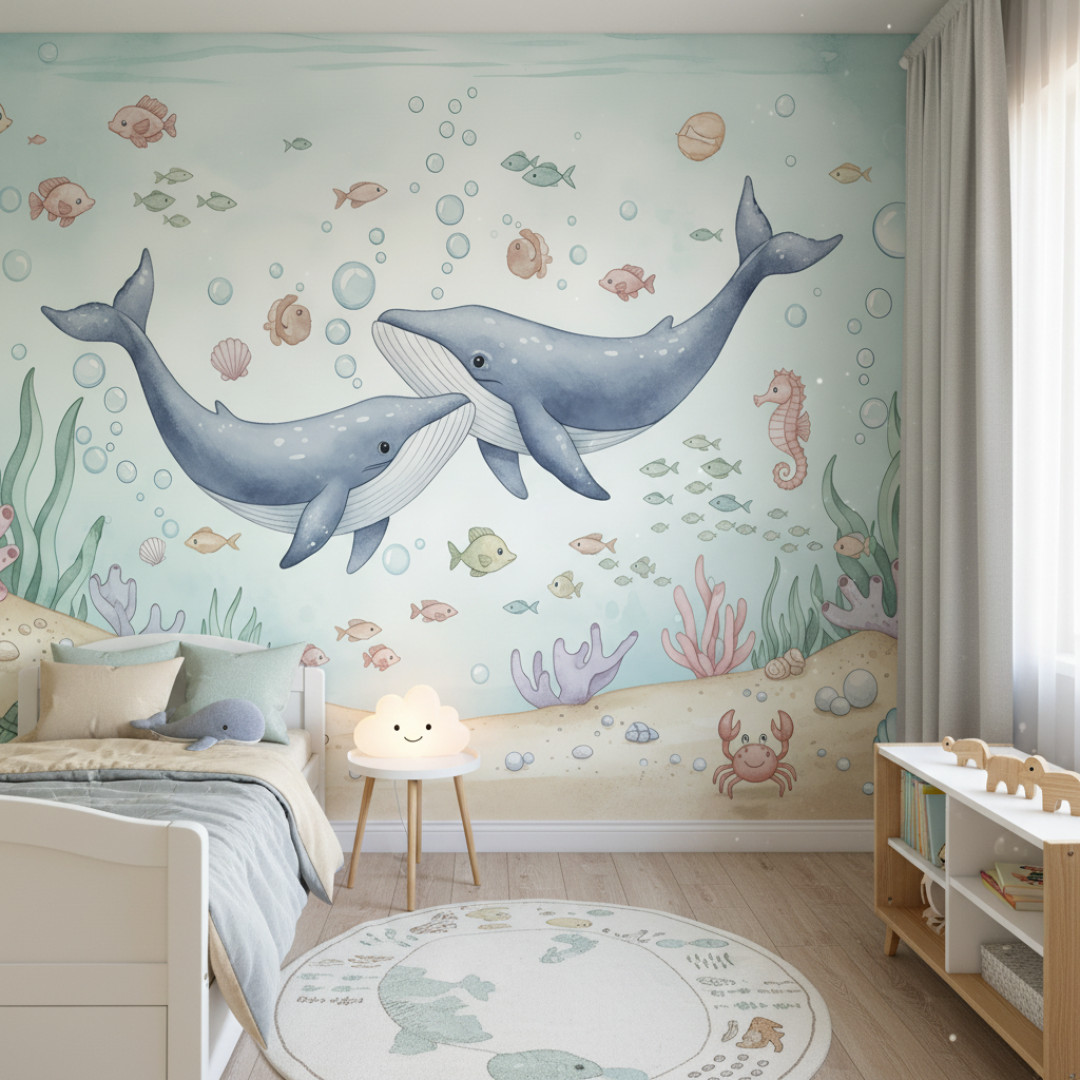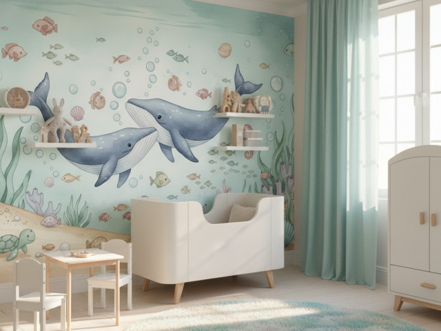 Blue Sea to tapeta dziecięca z ilustracyjnym motywem wielorybów w podwodnym świecie. Delikatna kolorystyka oraz spokojne morskie detale tworzą harmonijne, estetyczne tło do pokoju dziecka, które nie przytłacza wnętrza.