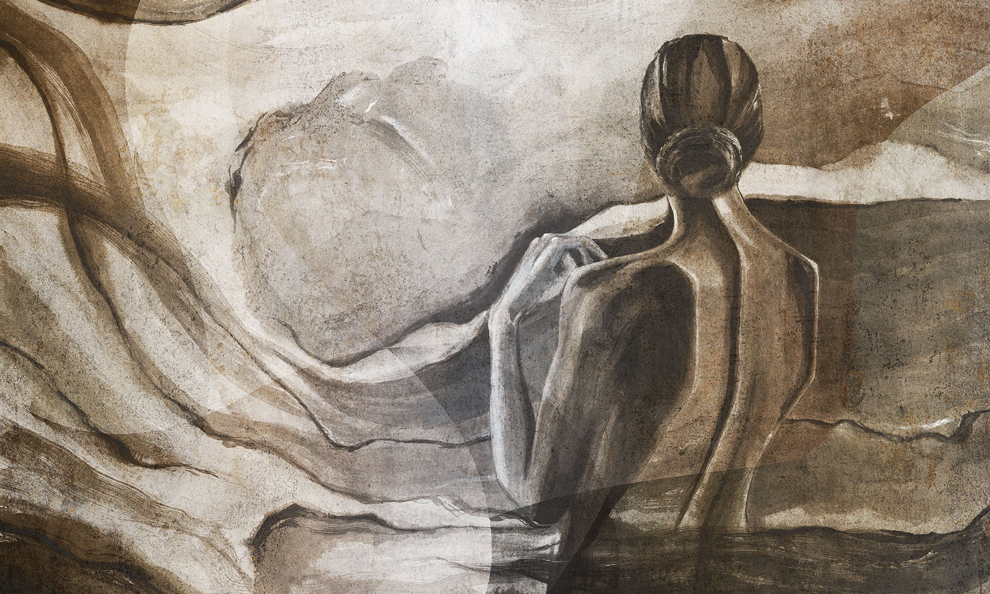 Tapeta ścienna z artystycznym motywem kobiecej sylwetki w odcieniach szarości i rudości. Dynamiczne pociągnięcia pędzla tworzą ekspresyjną, nastrojową kompozycję o głębokim, malarskim charakterze.