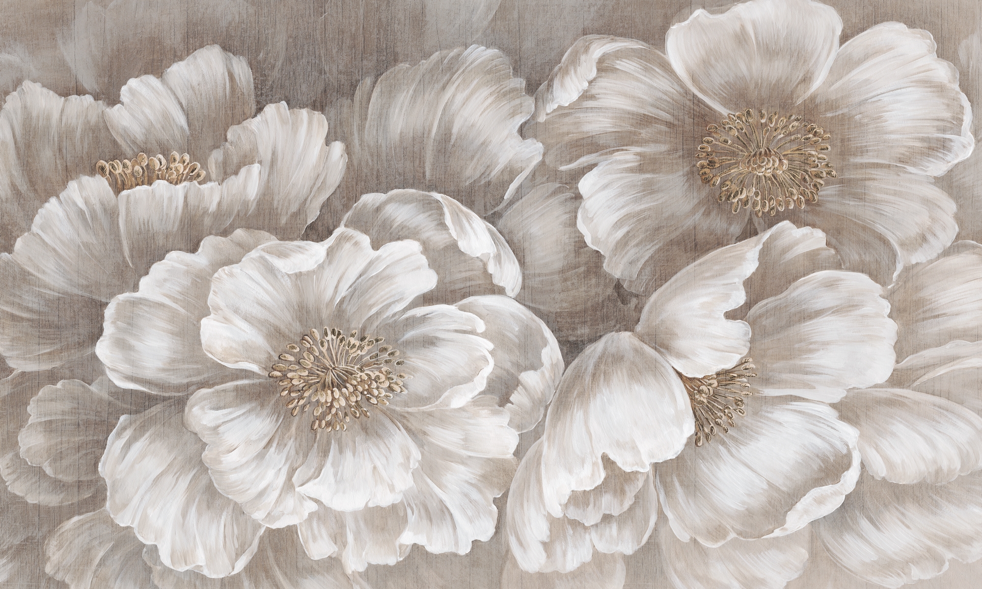 Tapeta ścienna z dużymi, ręcznie malowanymi kwiatami w odcieniach beżu i kremu. Subtelna faktura i miękkie pociągnięcia pędzla nadają wnętrzu ciepła i elegancji.
