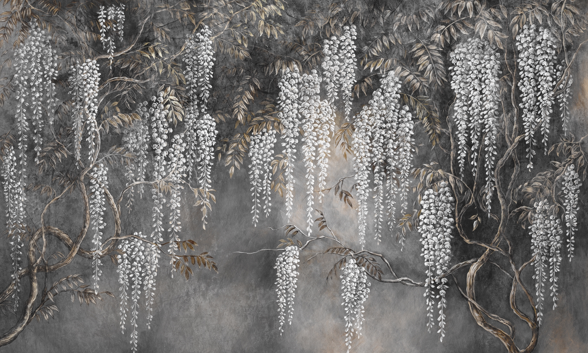 Tapeta ścienna w tonacji grafitu i szarości z białymi kwiatostanami wisterii. Wyrazista, nastrojowa dekoracja o artystycznym charakterze podkreśla elegancję przestrzeni.