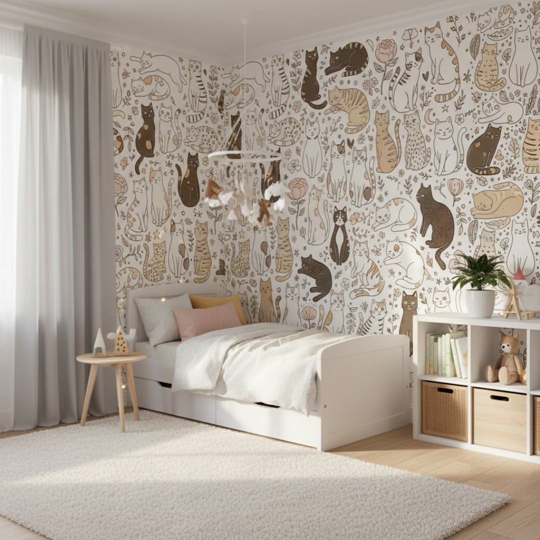 Happy Cats to tapeta dziecięca z ilustracyjnym motywem kotów, zaprojektowana jako spokojne i estetyczne tło do pokoju dziecka. Subtelny, powtarzalny wzór wprowadza ciepłą atmosferę i nie przytłacza wnętrza.