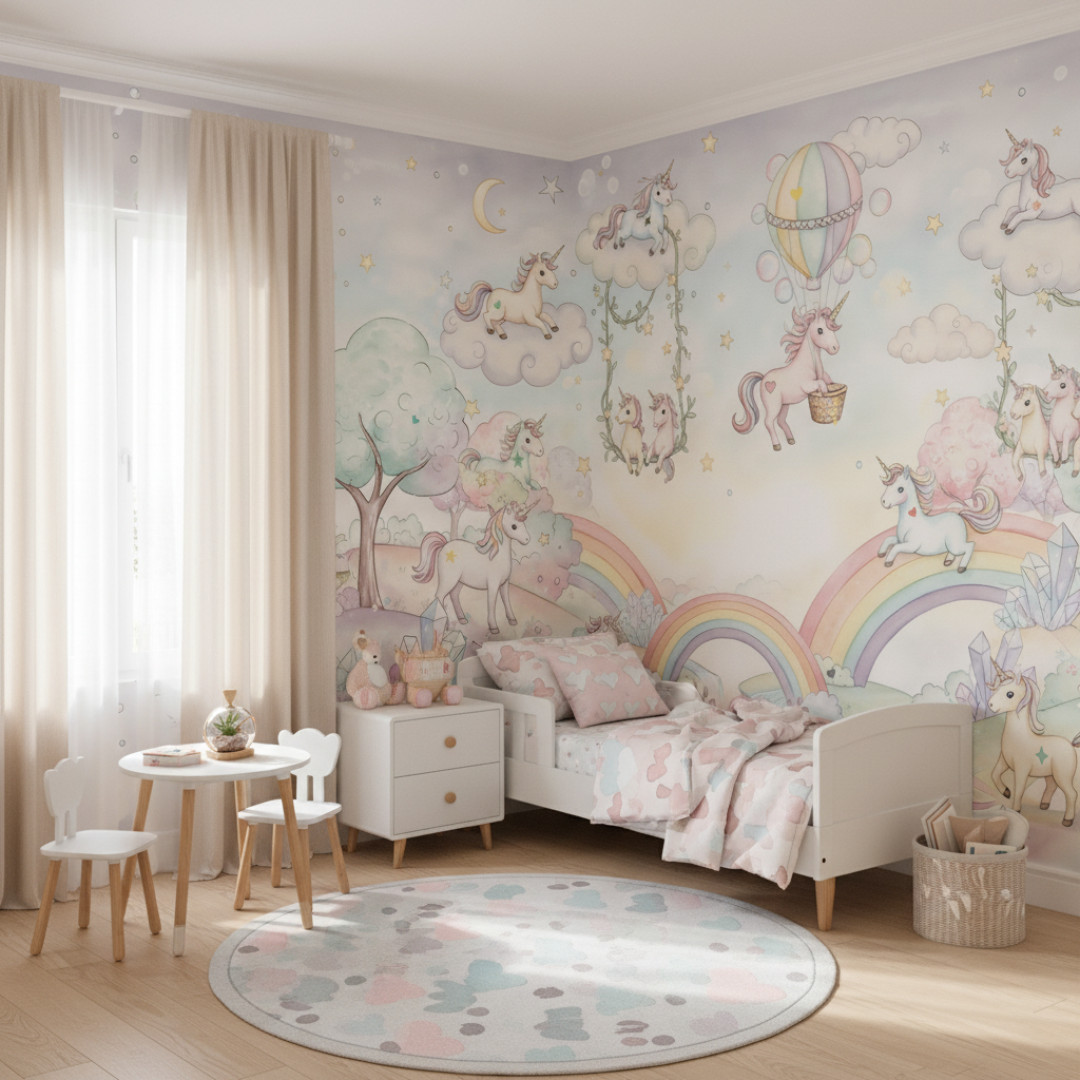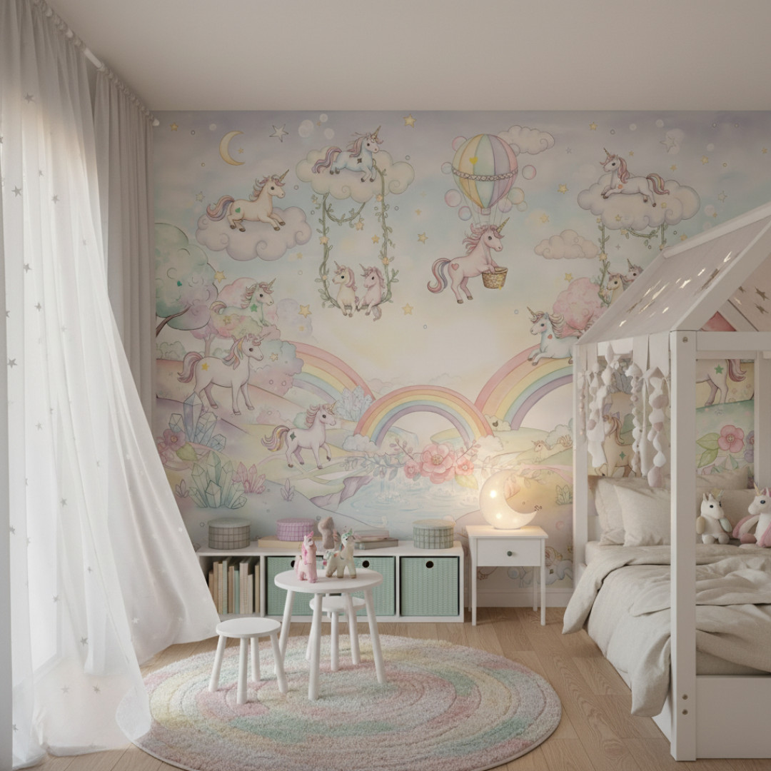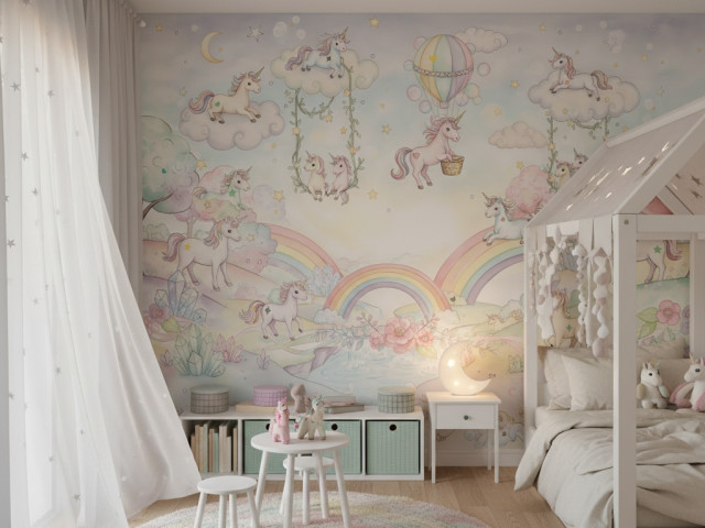 Magic Unicorns to tapeta dziecięca z bajkowym motywem jednorożców, chmur i tęczy, zaprojektowana z myślą o stworzeniu spokojnej i magicznej przestrzeni w pokoju dziecka. Delikatna ilustracja oraz pastelowa kolorystyka w odcieniach błękitu, różu i kremu wprowadzają lekkość, harmonię i marzycielski klimat.