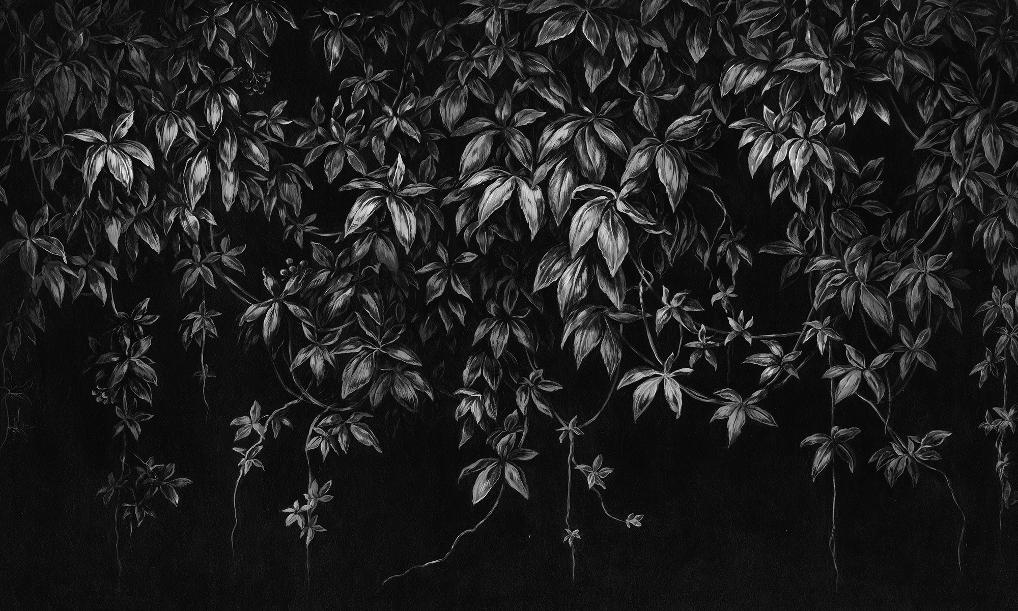 Nowoczesna tapeta ścienna z motywem liści w czerni i bieli. Minimalistyczna dekoracja, która idealnie podkreśla styl loftowy i monochromatyczne aranżacje
