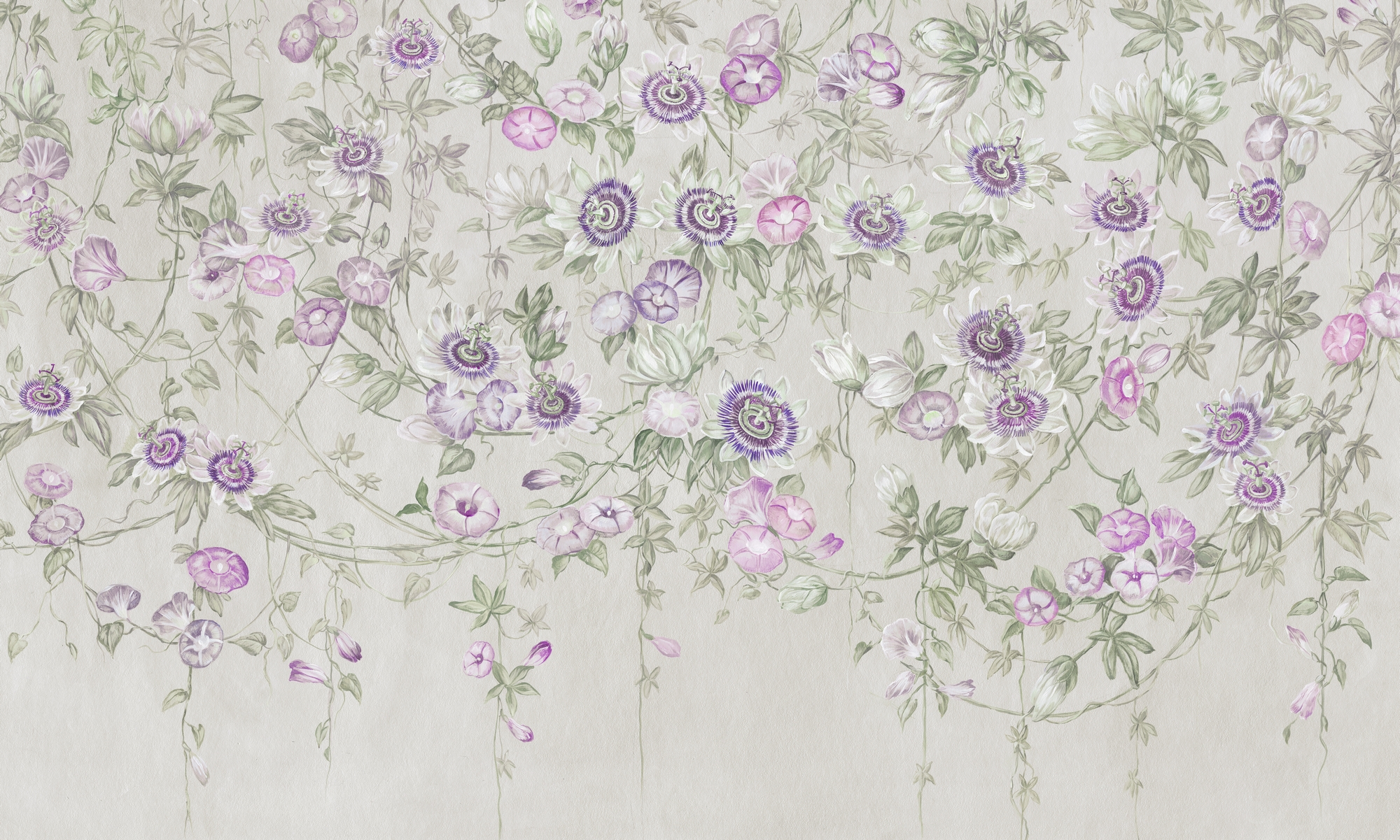 Delikatna tapeta ścienna z motywem kwiatów passiflory w odcieniach lawendy i mięty. Subtelny rysunek i jasne tło wprowadzają do wnętrza świeżość, lekkość i romantyczny spokój.