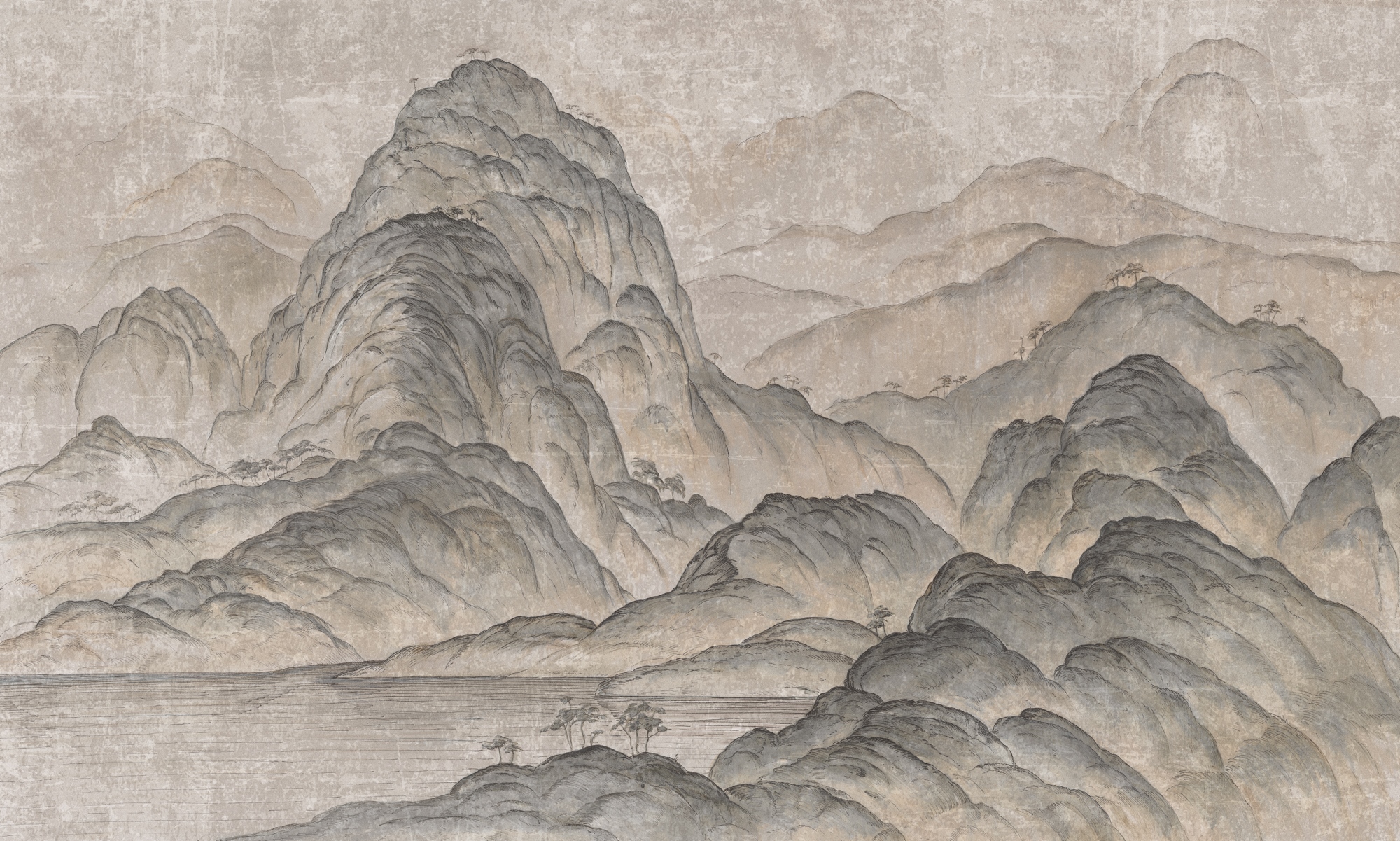 Malarska tapeta ścienna inspirowana górskim pejzażem. Subtelne odcienie beżu i szarości tworzą spokojną, harmonijną kompozycję o naturalnym charakterze.