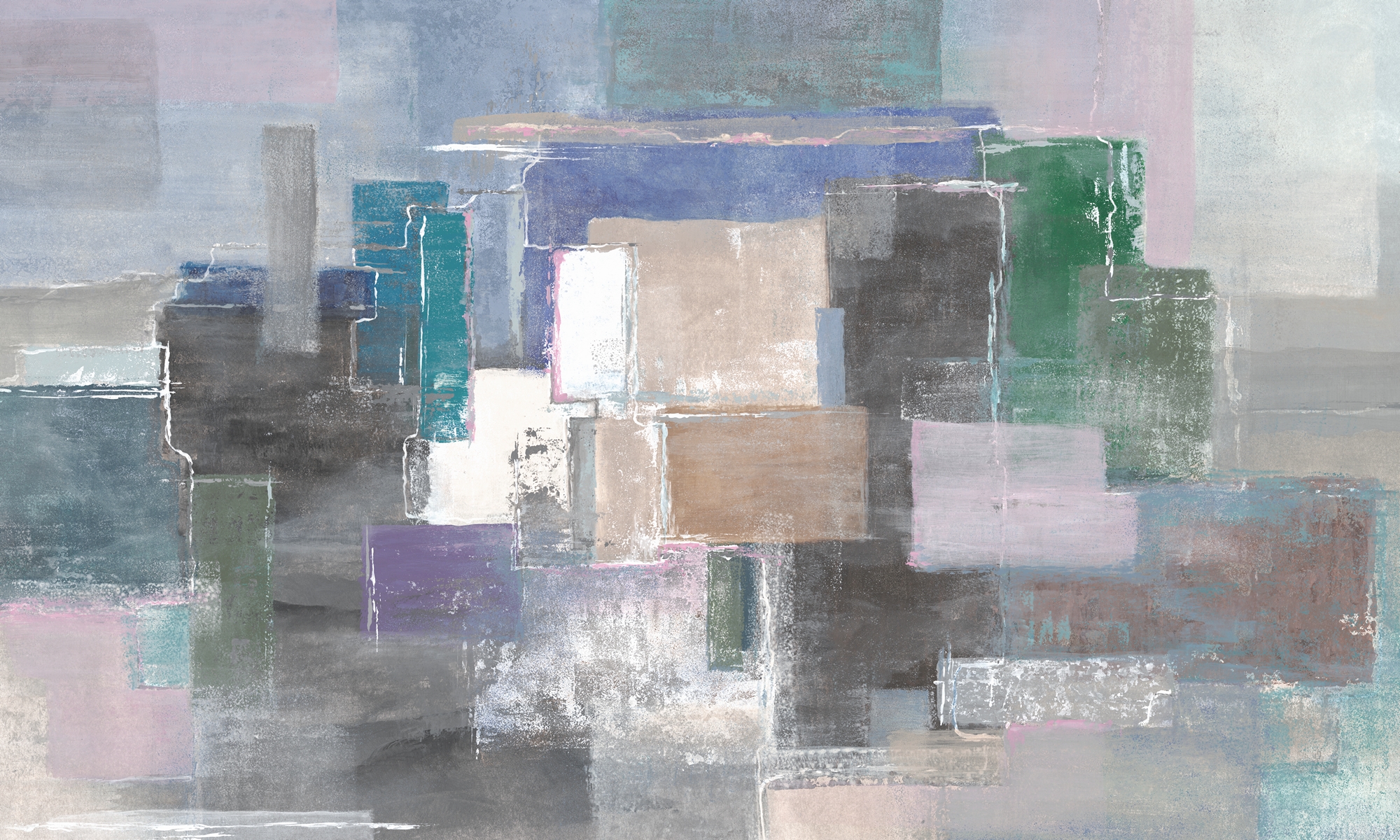 Abstrakcyjna kompozycja inspirowana miejskim pejzażem. Połączenie chłodnych błękitów, szarości i akcentów zieleni tworzy spokojną, harmonijną przestrzeń.