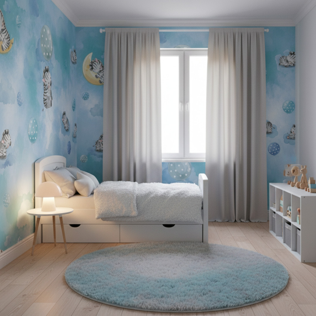 Zebra Sky to tapeta dziecięca z ilustracyjnym motywem uroczych zeberek unoszących się na tle chmur i nieba. Delikatny, powtarzalny wzór w pastelowych odcieniach błękitu tworzy spokojną i harmonijną przestrzeń, idealną do pokoju dziecka.