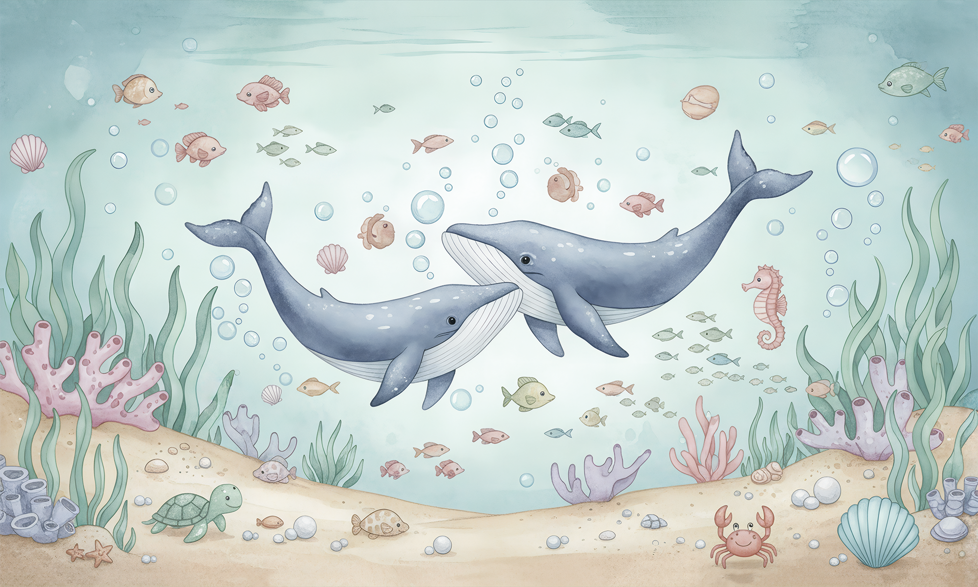 Blue Sea to tapeta dziecięca z ilustracyjnym motywem wielorybów w podwodnym świecie. Delikatna kolorystyka oraz spokojne morskie detale tworzą harmonijne, estetyczne tło do pokoju dziecka, które nie przytłacza wnętrza.