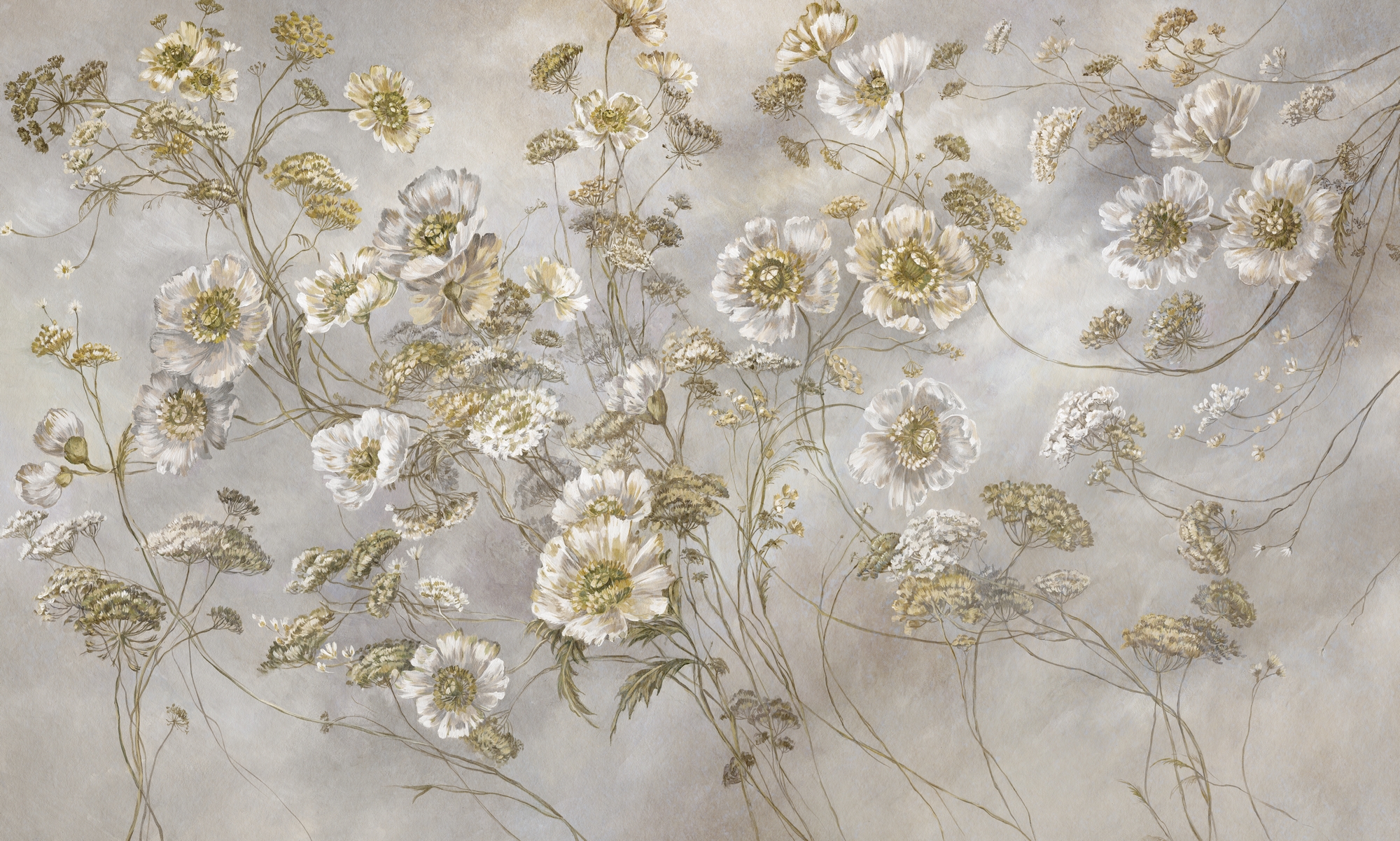 Tapeta ścienna w beżowej tonacji z drobnymi, zielono-białymi kwiatami. Lekka i harmonijna – wprowadza świeżość i naturalny urok.