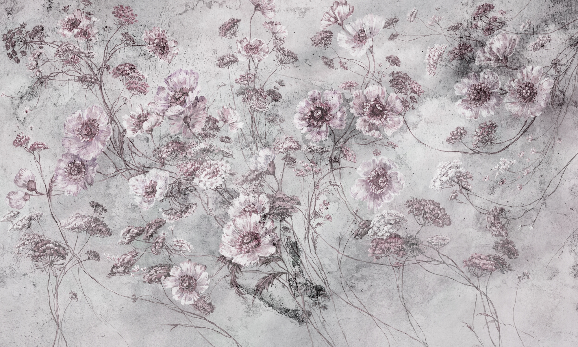 Tapeta w szaro-różowej tonacji z drobnym, romantycznym motywem kwiatów. Wnosi do wnętrza elegancję i ciepło.