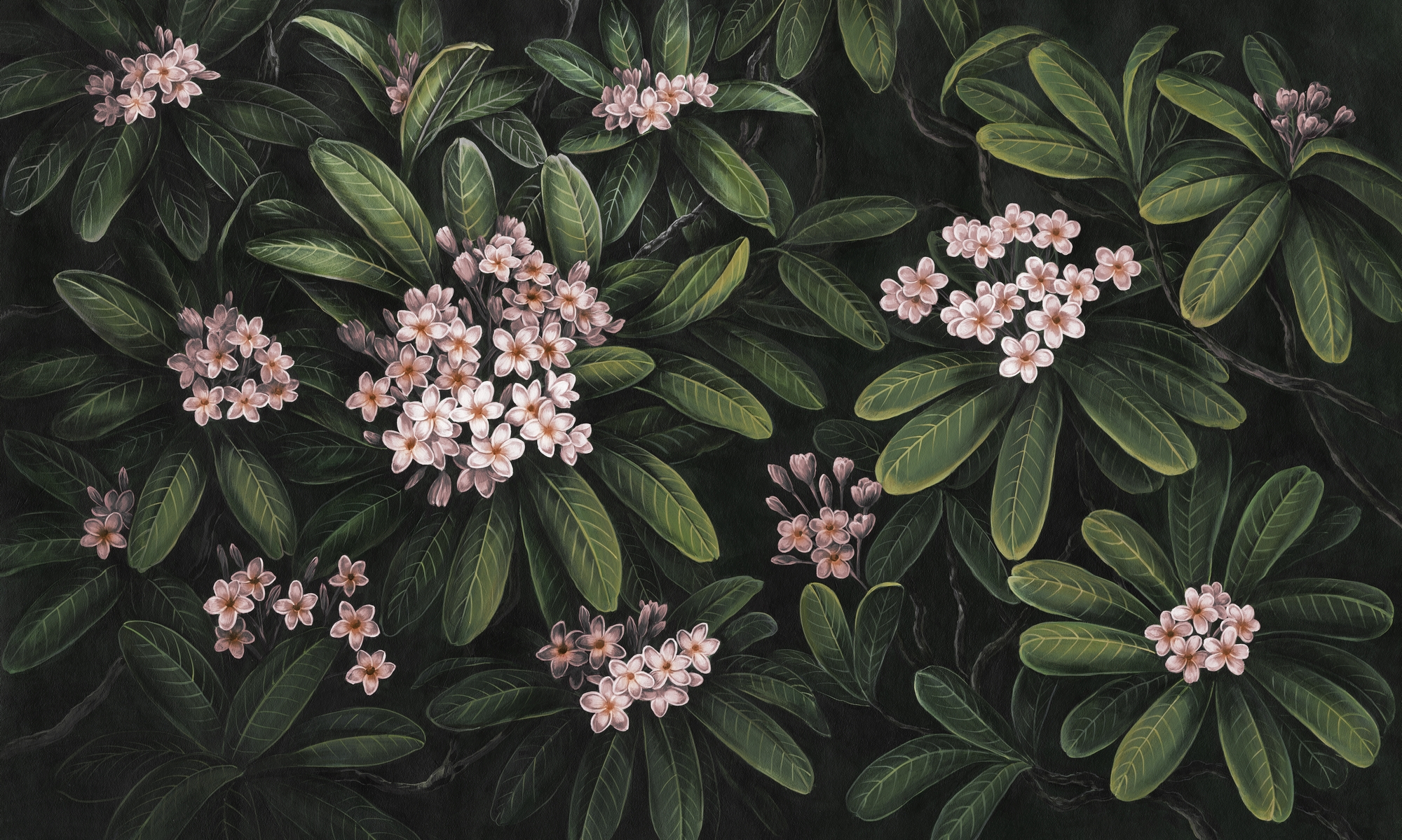 Tapeta ścienna w butelkowej zieleni z delikatnymi, różowymi kwiatami frangipani. Malarski efekt i głębia koloru wprowadzają do wnętrza świeżość i elegancki, naturalny urok.