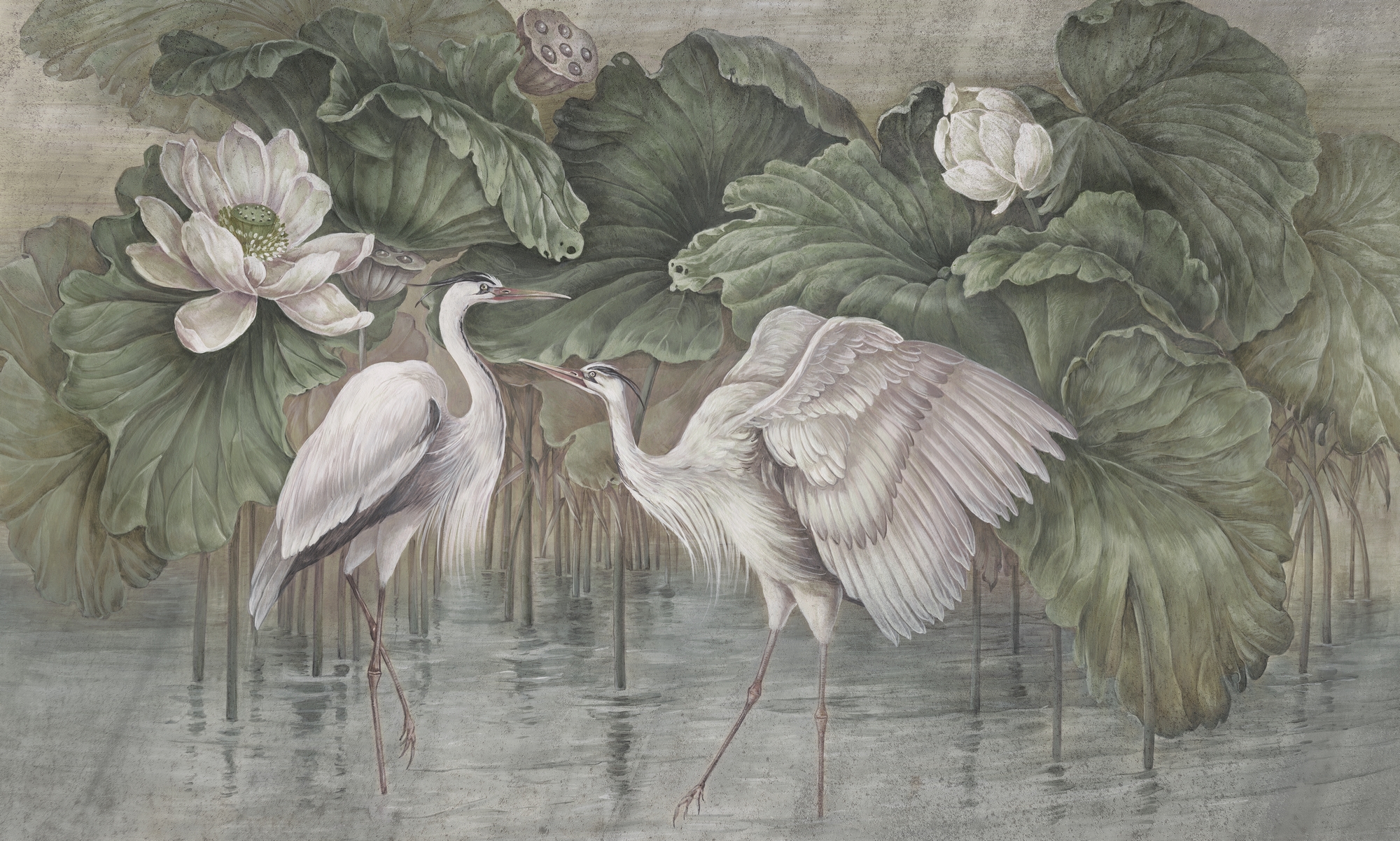 Artystyczna tapeta przedstawiająca żurawie pośród zielonych liści. Naturalna kolorystyka i delikatne światło wprowadzają do wnętrza harmonię i lekkość natury.