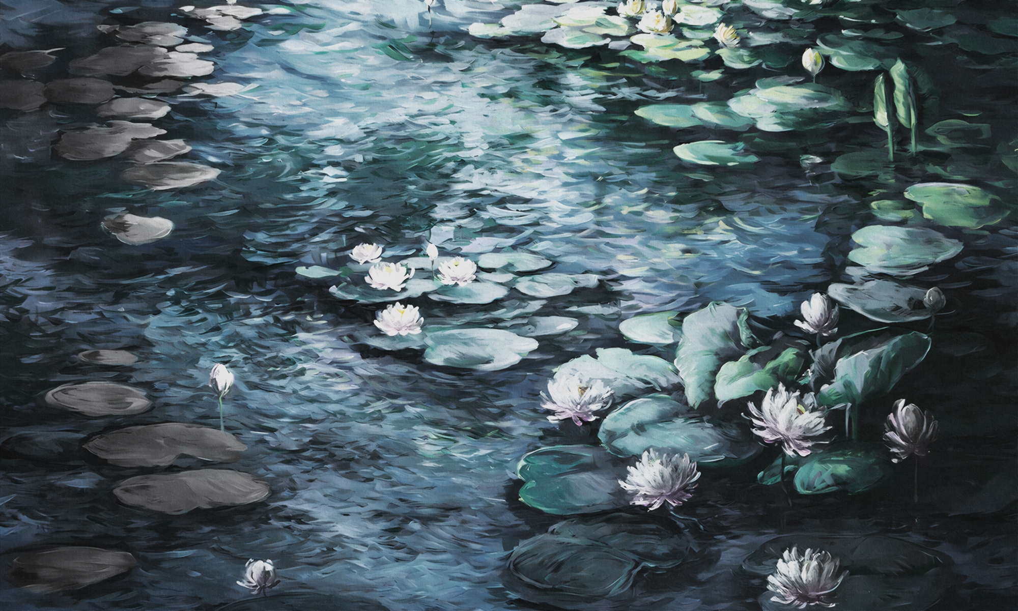 Tapeta ścienna w turkusowo-niebieskiej tonacji z białymi liliami. Malarski efekt nadaje wnętrzu świeżości i wyrafinowanej elegancji.