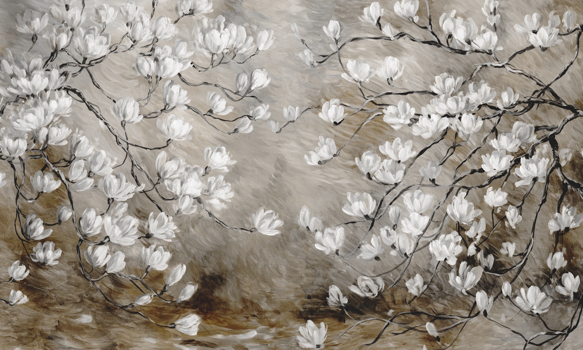 Tapeta ścienna w ciepłych beżowo-brązowych tonach z motywem kwiatów magnolii malowanych farbą. Artystyczny, realistyczny obraz wnosi do wnętrza przytulność, elegancję i subtelny naturalny urok.