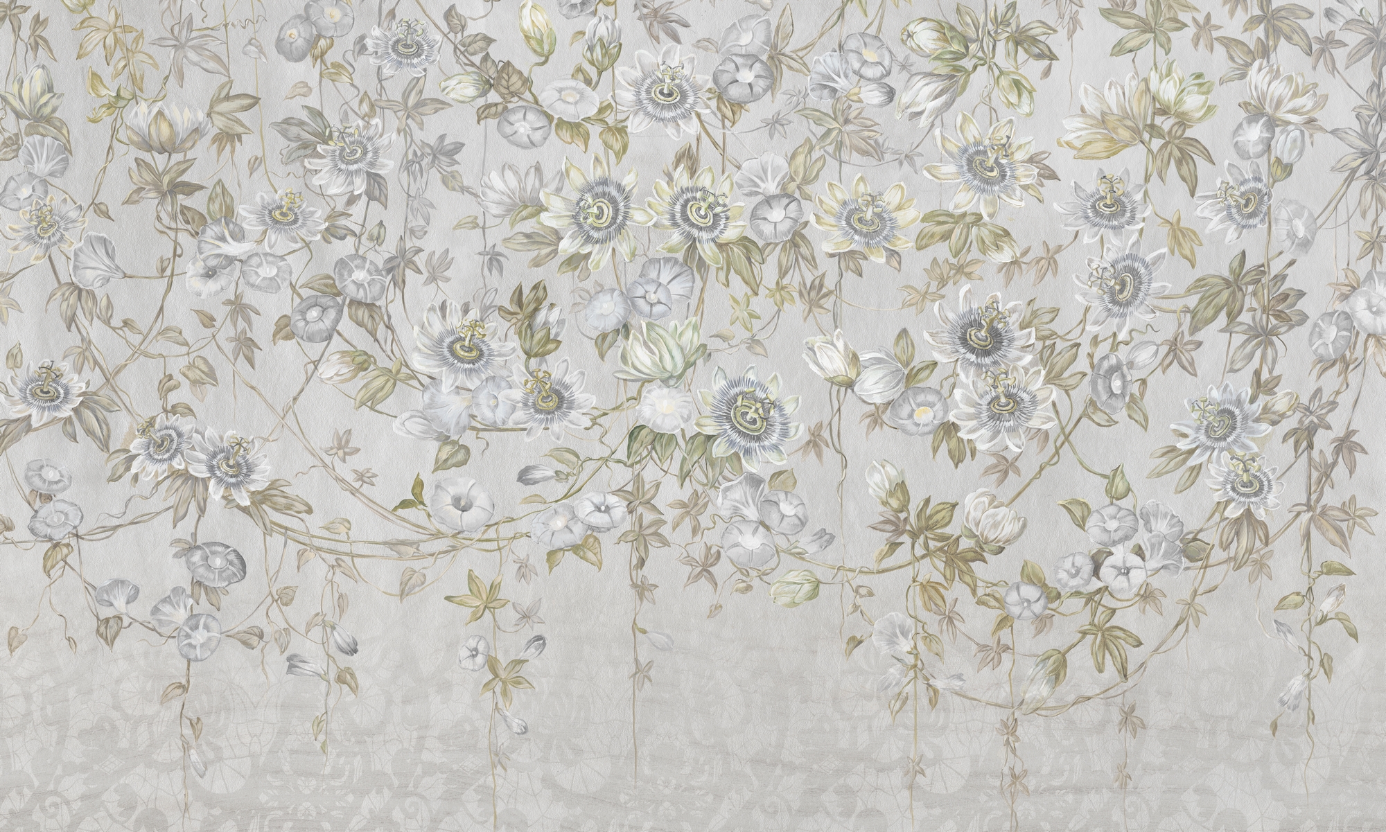 Elegancka tapeta kwiatowa utrzymana w tonacji szarości i oliwkowych beży. Lekko przecierane tło i misterny detal tworzą harmonijną, wyciszającą kompozycję o naturalnym charakterze.