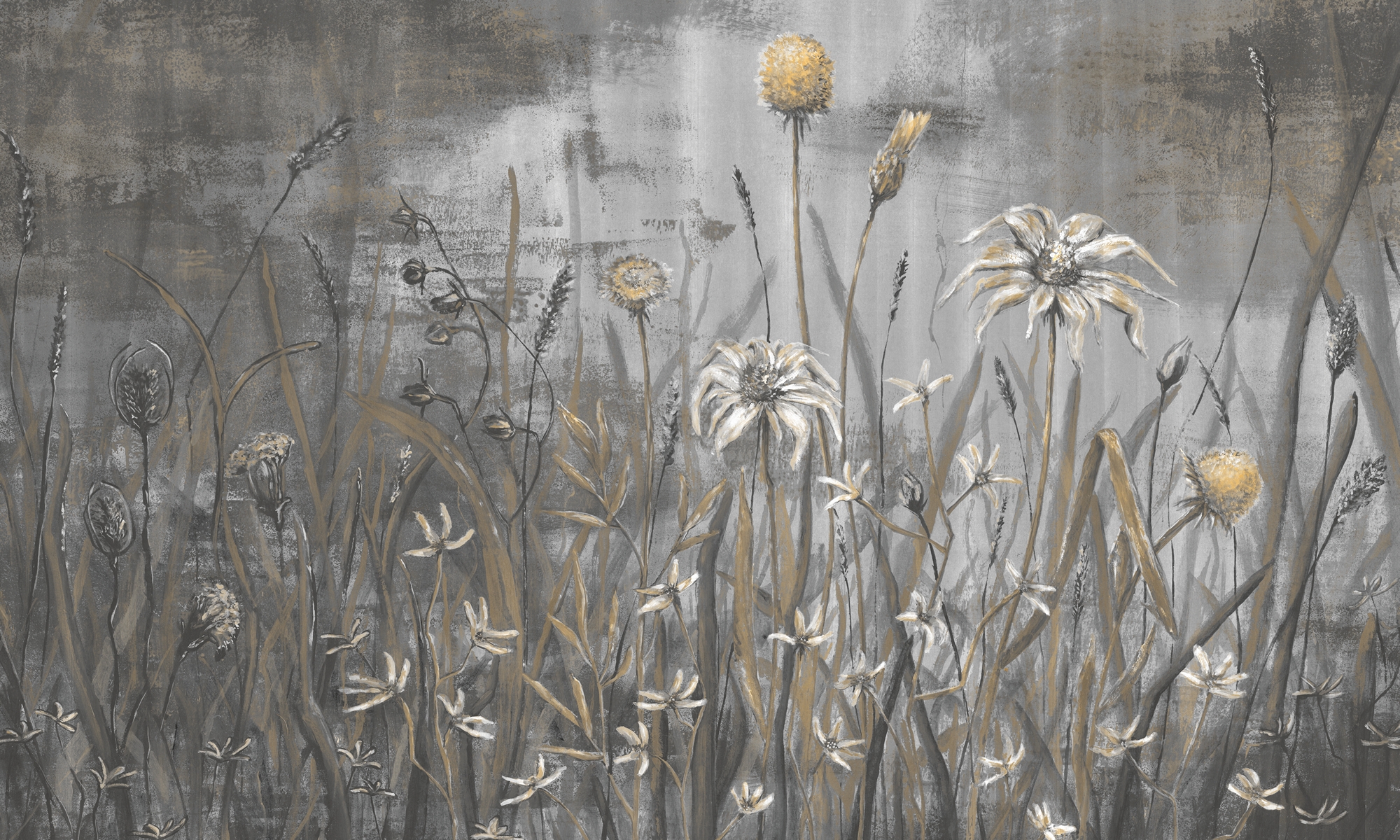 Tapeta ścienna w odcieniach grafitu i złamanej ochry z motywem dzikich kwiatów. Ciepłe akcenty przełamują chłód szarości, nadając dekoracji głębi i wyrafinowanego charakteru. Doskonała do wnętrz w stylu loft, modern classic lub art déco.