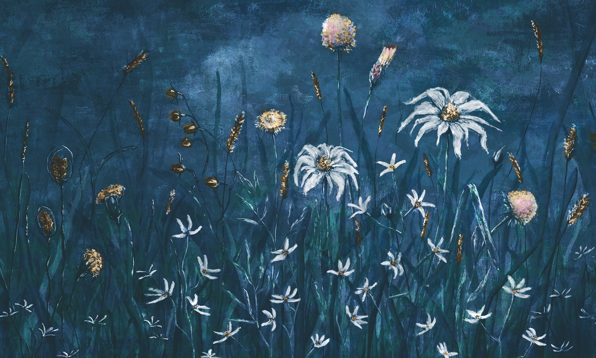 Tapeta ścienna w głębokich, granatowych tonach z motywem białych i złocistych kwiatów. Intensywna kolorystyka i malarski efekt tworzą nastrojową, artystyczną przestrzeń pełną elegancji i wyrazistości. Idealna do nowoczesnych i eklektycznych aranżacji.