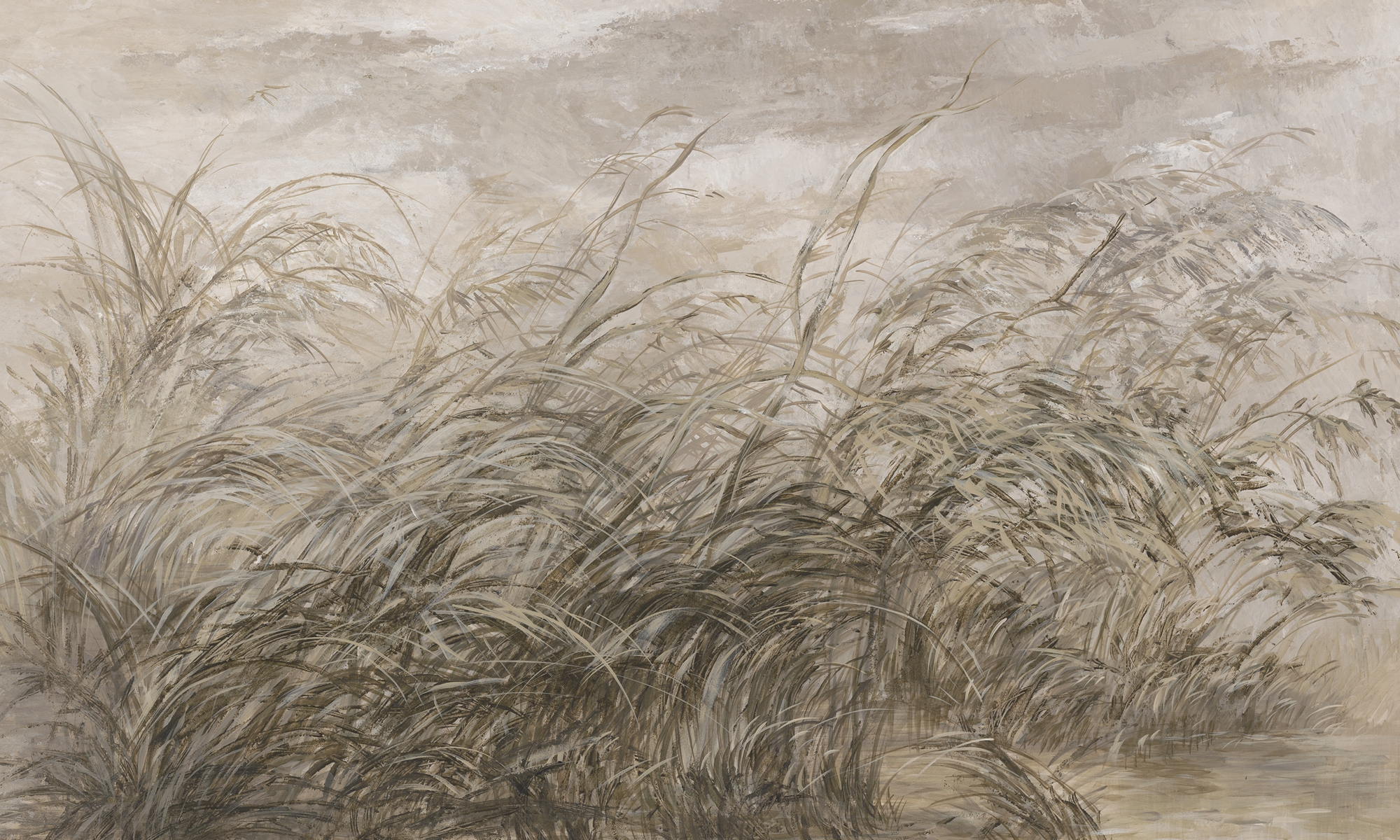 Malarska kompozycja inspirowana poranną mgłą i ruchem traw na wietrze. Ciepłe beże i brązy wprowadzają spokój i naturalny rytm do wnętrza.