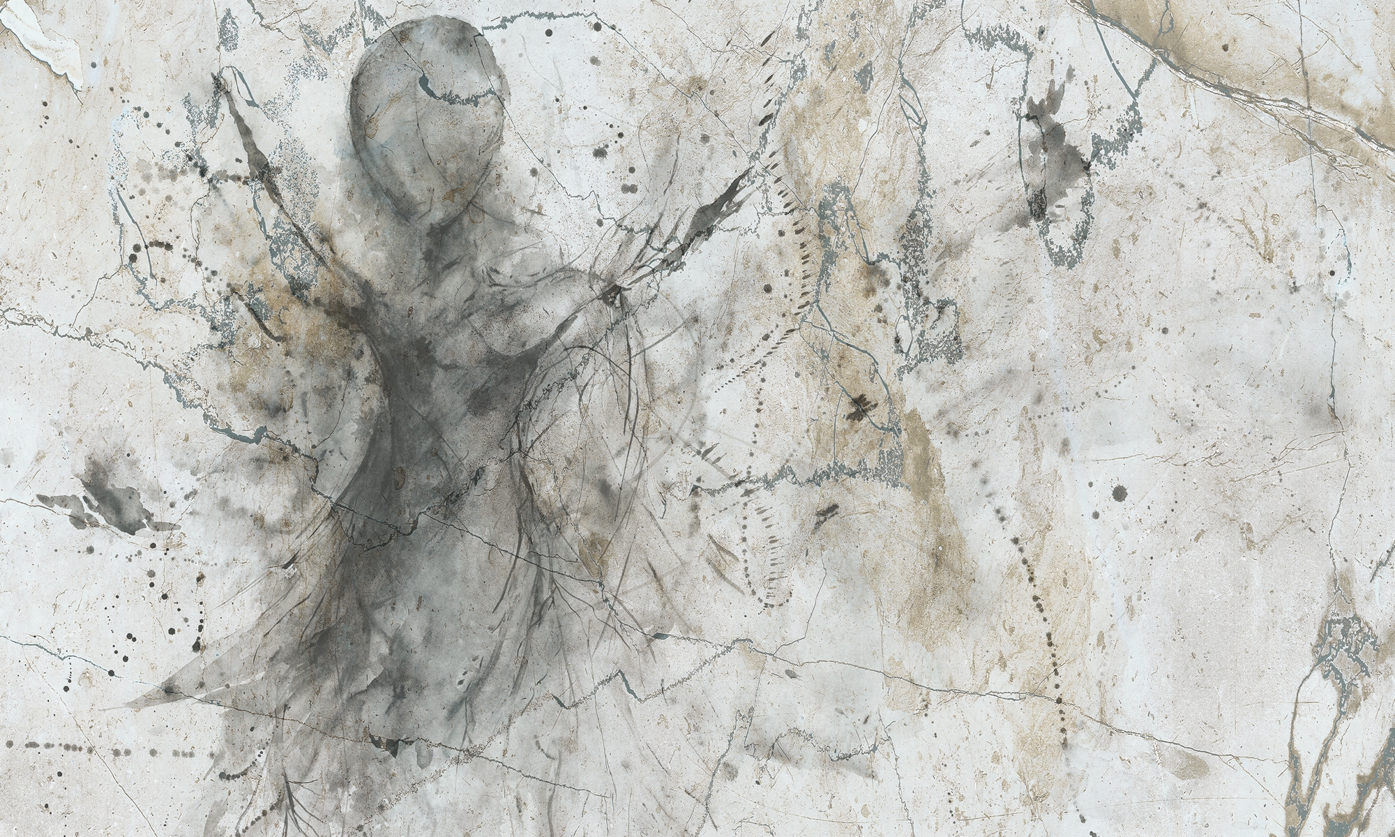 Połączenie surowej struktury i malarskiej lekkości. Ciepłe beże i zgaszone szarości budują spokojny, refleksyjny klimat.