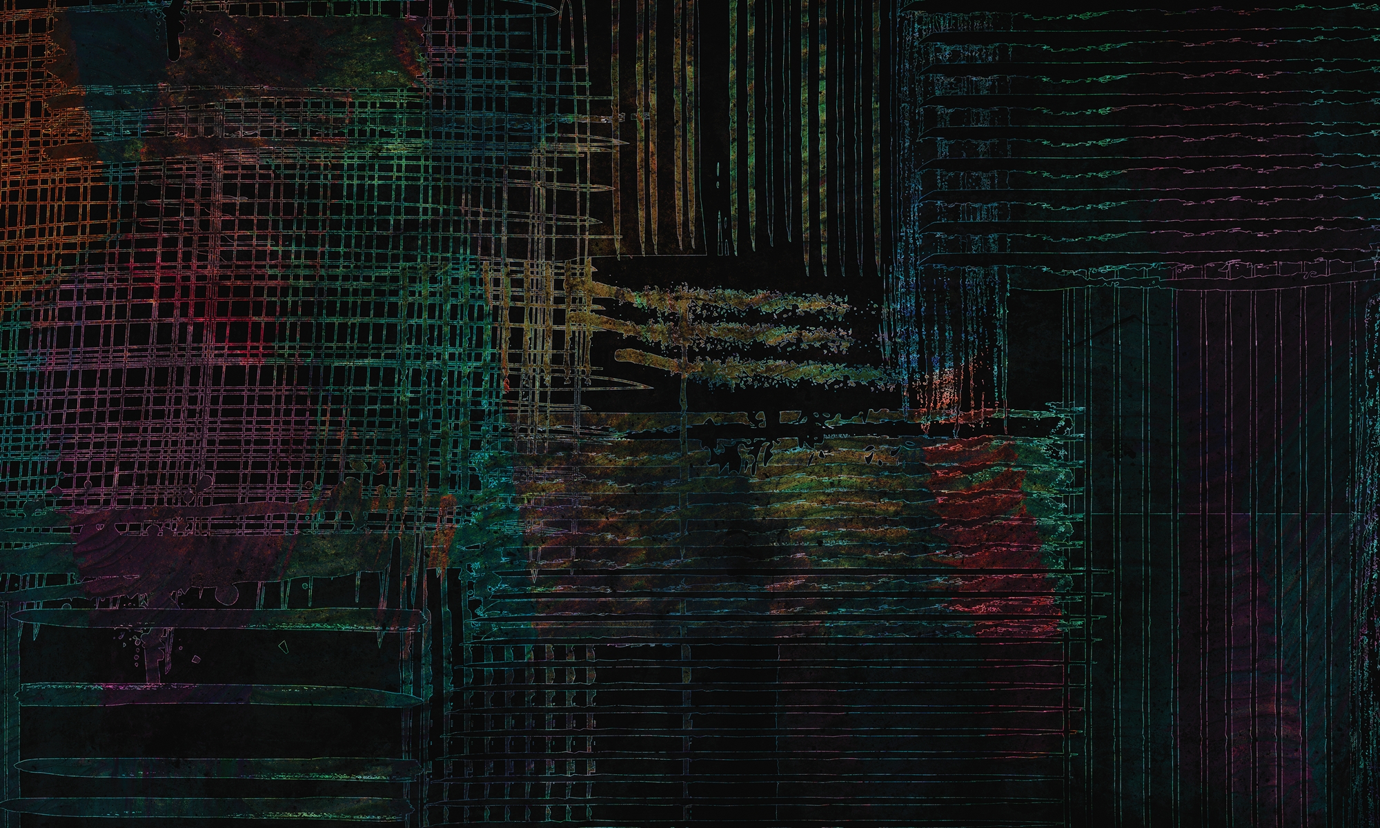 Hipnotyzująca gra kolorów i linii. Ciemne tło ożywione neonowymi refleksami przywodzi na myśl pulsujące światłem miejskie pejzaże.