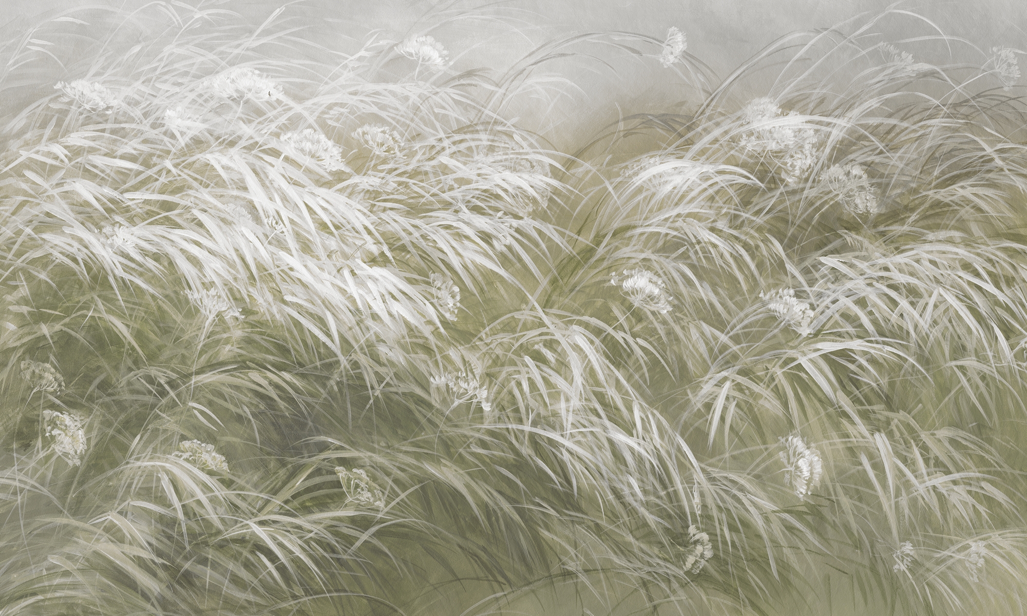 Lekki, botaniczny wzór w tonach zieleni i szarości. Przywołuje wrażenie letniego wiatru i dodaje wnętrzu świeżości oraz eleganckiej lekkości.