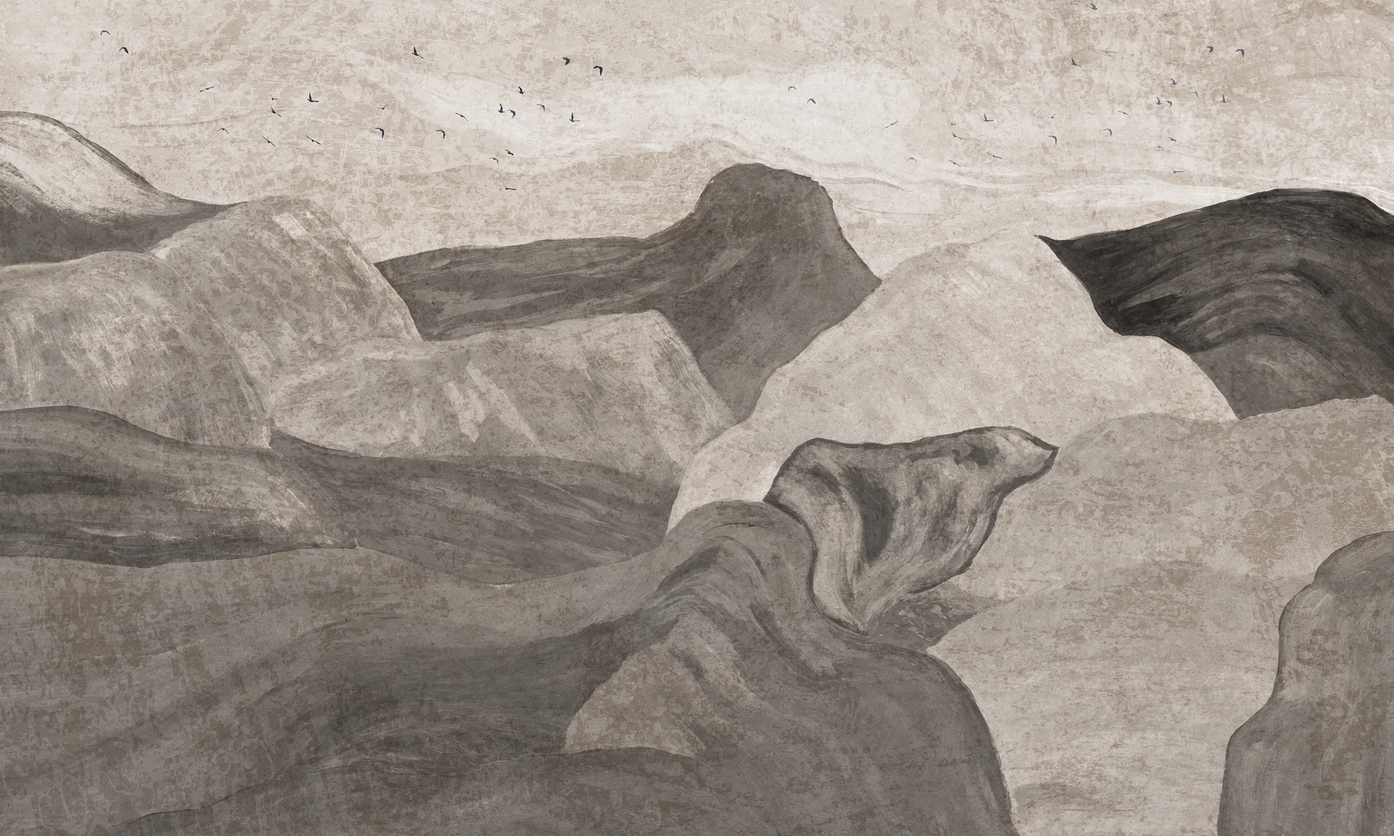 Tapeta ścienna w odcieniach beżu i szarości, inspirowana pejzażem górskim. Miękkie, płynne linie tworzą harmonijną, naturalną kompozycję o spokojnym, artystycznym charakterze.