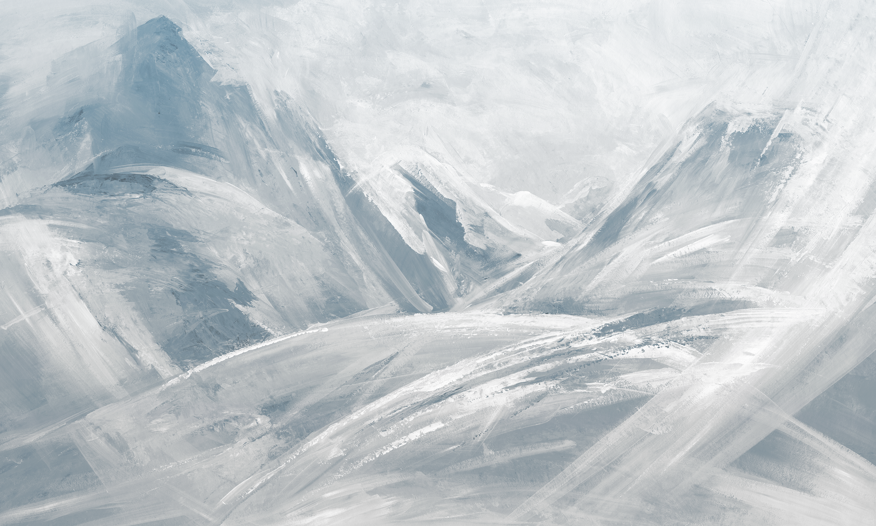 Abstrakcyjna tapeta w chłodnych odcieniach błękitu i szarości. Artystyczny krajobraz o miękkiej dynamice form nadaje wnętrzu głębię i nowoczesną elegancję.