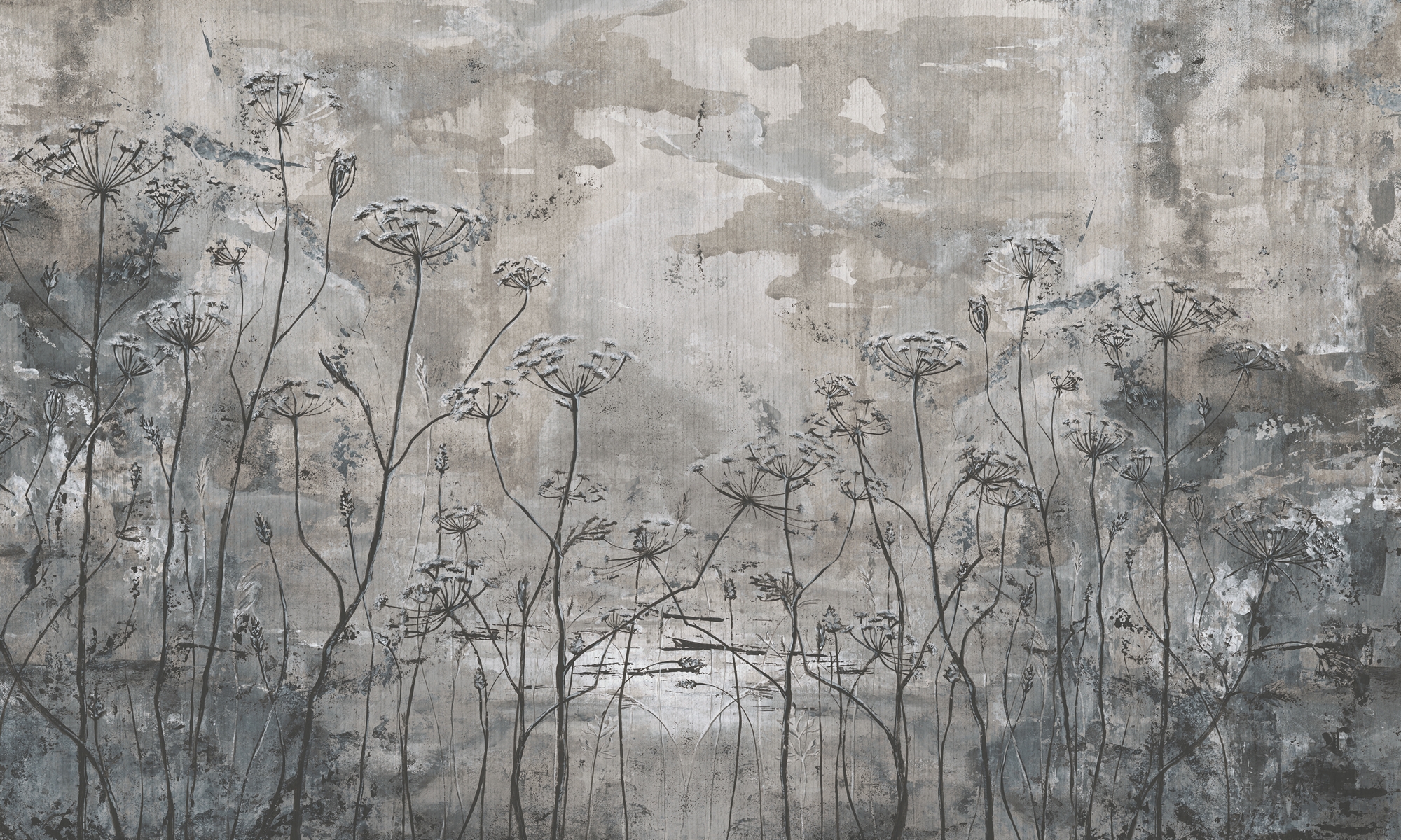 Tapeta ścienna w chłodnych, stalowo-beżowych tonach z motywem dzikich kwiatów. Malarski efekt o strukturze przypominającej surowy tynk tworzy nastrojową, organiczną kompozycję. Idealna do wnętrz w stylu loft, japandi i modern organic — dodaje głębi i naturalnej elegancji.