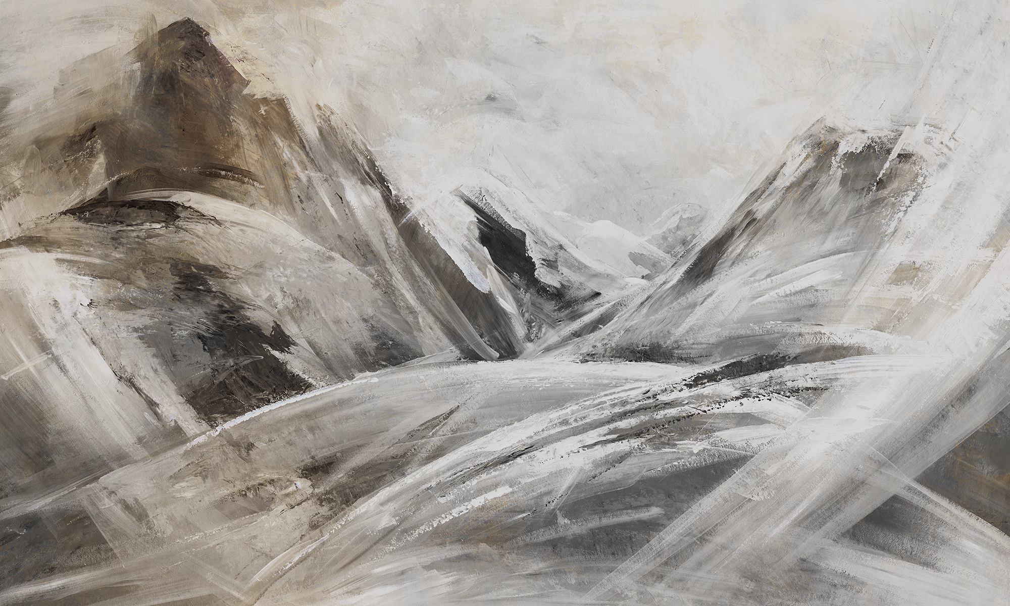Dynamiczna tapeta z abstrakcyjnym motywem gór w odcieniach beżu i szarości. Malarskie pociągnięcia pędzla tworzą efekt ruchu i przestrzeni, idealny do nowoczesnych wnętrz.